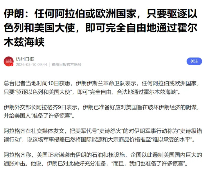 革命卫队表示:任何阿拉伯或欧洲国家,只要「驱逐以色列和美国大使」,即可「完全自由、合法地通过霍尔木兹海峡」。